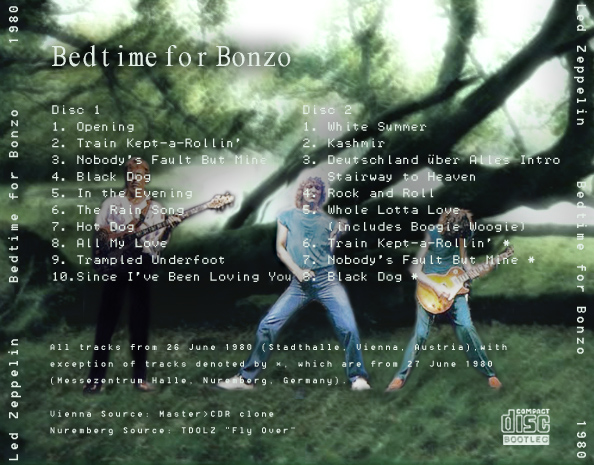 Now I must admit that I didn’t contribute much to this CD cover. The seeder of this concert had a little inspiration from an old Reegan movie, whose chimp star shared the same nickname with John Bonham. A fellow trader took the idea and stuck good ole Bonzo’s head on the chimp’s. All I merely did was to do some skin tone colour corrections, as well as to digitally enhance the picture, which was originally of a lower resolution. I just thought I’d put this up because it really is so quirky.